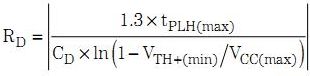 當(dāng)總線電壓變?yōu)檎╒Bus > 200 mV)時,RX1 輸出變?yōu)楦?,其?qū)動 DR2 輸出為高,并通過 RD 對 CD 緩慢充電。必須正確計算最小時間常量(RD × CD),以使最大電源電壓 VCC(max) 和最小正反相器輸入閾值VTH+(min) 時,延遲時間tD 超過驅(qū)動器最大低到高傳播延遲 tPLH(max),即超出 30%。例如,電容為 CD = 100 Pf 時,RD 的要求電阻值為: