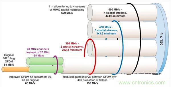 搜各種百科資料IEEE802.11詞條,我們可以讀到,從802.11n開始,數(shù)據(jù)傳輸速率或者說承載的數(shù)據(jù)量有了很大的提升。首先,802.11n有了40MHz模式,然而按照之前的理論,它的發(fā)射范圍應(yīng)該因此降低一半才對(duì),但事實(shí)上數(shù)據(jù)反而提升了一倍(70m),這又是怎么一回事?