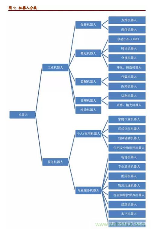 機(jī)器人專家從機(jī)器人應(yīng)用環(huán)境出發(fā),將機(jī)器人分為兩大類,即工業(yè)機(jī)器人和服務(wù)機(jī)器人。工業(yè)機(jī)器人根據(jù)用途不同,大致可以分為焊接機(jī)器人、搬運(yùn)機(jī)器人、噴漆機(jī)器人、涂膠機(jī)器人、裝配機(jī)器人、碼垛機(jī)器人、切割機(jī)器人、自動(dòng)牽引車(AGV)機(jī)器人、凈室機(jī)器人等。而服務(wù)機(jī)器人則是除工業(yè)機(jī)器人之外的、用于非制造業(yè)并服務(wù)于人類的各種先進(jìn)機(jī)器人,主要包括個(gè)人/家用服務(wù)機(jī)器人和專業(yè)服務(wù)機(jī)器人。其中,個(gè)人/家用機(jī)器人主要包括:家庭作業(yè)機(jī)器人、娛樂休閑機(jī)器人、殘障輔助機(jī)器人、住宅安全和監(jiān)視機(jī)器人等;專業(yè)服務(wù)機(jī)器人主要包括:場(chǎng)地機(jī)器人、專業(yè)清潔機(jī)器人、醫(yī)用機(jī)器人、物流用途機(jī)器人、檢查和維護(hù)保養(yǎng)機(jī)器人、建筑機(jī)器人、水下機(jī)器人,以及國(guó)防、營(yíng)救和安全應(yīng)用機(jī)器人等等。