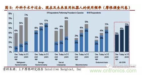 雖然當(dāng)前醫(yī)用機(jī)器人普及率還很低,并且安裝的大部分是發(fā)達(dá)國(guó)家,但摩根的近期的一個(gè)調(diào)查研究中問及外科醫(yī)生們未來他們會(huì)在自己在手術(shù)中多高頻率的使用醫(yī)用機(jī)器人,數(shù)據(jù)表明美國(guó)的外科醫(yī)生們認(rèn)為未來3-5年里醫(yī)用機(jī)器人在手術(shù)中的使用率會(huì)迅速上升到一個(gè)比較高的層次,約占50%,醫(yī)用機(jī)器人市場(chǎng)潛力巨大。IFR預(yù)測(cè)在未來的4年里,醫(yī)療機(jī)器會(huì)以每年19%的速度增長(zhǎng),2016年全球市場(chǎng)規(guī)模估計(jì)會(huì)增長(zhǎng)到119億美元。