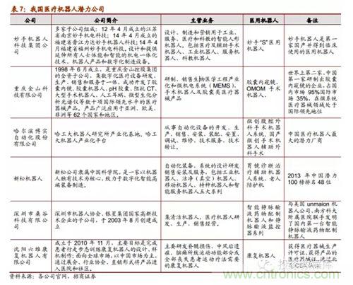 隨著醫(yī)用機(jī)器人技術(shù)的不斷突破和發(fā)展,從2005年開始我國(guó)有一批重點(diǎn)高??蒲嗅t(yī)院?jiǎn)挝患把芯克谘芯酷t(yī)用機(jī)器人系統(tǒng)并取得了一些小成就,比如哈工大的微創(chuàng)腹腔外科手術(shù)機(jī)器已經(jīng)成功被專家驗(yàn)收,天津大學(xué)的妙手機(jī)器人在今年3月份開始臨床使用;同時(shí),隨著醫(yī)用機(jī)器人商業(yè)化市場(chǎng)化的可能性愈發(fā)明晰,已經(jīng)有部分企業(yè)正在生產(chǎn)或者打算進(jìn)軍醫(yī)用機(jī)器人細(xì)分行業(yè),其中就包括機(jī)器人領(lǐng)先企業(yè)的博實(shí)股份和新松機(jī)器人。
