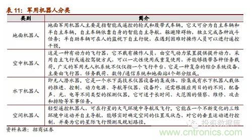 (五)軍事機(jī)器人是21世紀(jì)各國(guó)軍事安全重點(diǎn)戰(zhàn)略:蒂爾集團(tuán)稱未來10年全球無(wú)人機(jī)研發(fā)投入和采購(gòu)需求將達(dá)到940億美元。軍用機(jī)器人強(qiáng)國(guó)包括美德英法意以日韓,這些國(guó)家不僅在技術(shù)處于研究的先列,其產(chǎn)品已經(jīng)在軍事上有了實(shí)際運(yùn)用;我國(guó)與這些強(qiáng)國(guó)的技術(shù)差距明顯,受政策支持,軍事機(jī)器人相關(guān)企業(yè)發(fā)展前景明顯良好,可能成為企業(yè)未來強(qiáng)勁的收入保證。