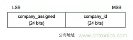 公有地址的構(gòu)成包含了兩個部分,一部分是公司識別碼(Company ID),其需要通過IEEE注冊機構(gòu)付費獲得,公司識別碼長度為24比特,處于48比特設(shè)備地址的高24比特;另外一部分是公司分配碼(Company Assigned ID),其長度也為24比特,處于48比特設(shè)備地址的低24bit,如下圖所示。