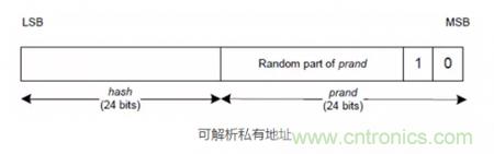 假設(shè)有兩個藍牙設(shè)備,分別是設(shè)備A和設(shè)備B,在兩個藍牙設(shè)備A、B建立連接之后,這兩個藍牙設(shè)備可以通過配對的方式交換各自的身份解析密鑰IRK(Identity Resolving Key, IRK),設(shè)備A的身份解析密鑰IRK-A,設(shè)備B的身份解析密鑰IRK-B。假設(shè)設(shè)備B采用了可解析的私有地址機制,那么設(shè)備B就需要周期性的產(chǎn)生可解析的私有地址。下圖是可解析隨機地址的結(jié)構(gòu),其中可解析隨機地址的高兩個比特分別為0和1,作為可解析地址的標(biāo)識符。
