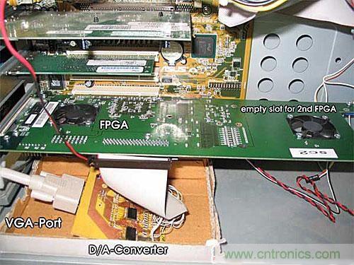 SaarCOR在SIGGRAPH 2005展示的RPU原型機(jī)用FPGA來(lái)構(gòu)建,頻率運(yùn)行在66MHz,內(nèi)存帶寬也只有350MB/s,但是得益于特別設(shè)計(jì)的專用架構(gòu),其性能可以跟P4 2.6G的CPU跑OpenRT軟件光線追蹤的性能相媲美。