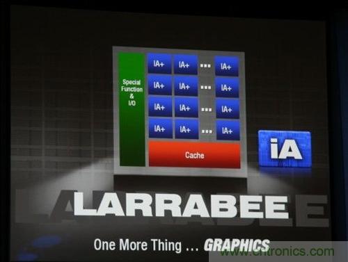 在2007年的IDF上,Intel正式揭開(kāi)獨(dú)立顯卡——代號(hào)“Larrabee”的神秘面紗,Larrabee隸屬于其萬(wàn)億次運(yùn)算項(xiàng)目(Tera-scale),也將是Intel的第一款實(shí)用級(jí)萬(wàn)億次運(yùn)算處理器,其處理能力“大大超過(guò)”一萬(wàn)億次浮點(diǎn)每秒;根據(jù)Intel首席架構(gòu)師EdDavis的演示文稿,Larrabee基于可編程架構(gòu),主要面向高端通用目的計(jì)算平臺(tái),至少有16個(gè)核心,主頻1.7-2.5GHz,功耗則在150W以上,支持JPEG紋理、物理加速、反鋸齒、增強(qiáng)AI、光線追蹤等特性。