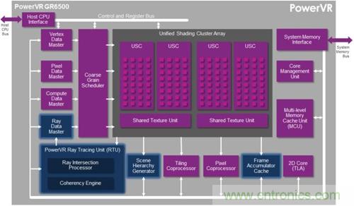新家族的第一名成員是PowerVR GR6500,基于最新一代的四陣列移動(dòng)GPU PowerVR Rogue設(shè)計(jì)而來(lái),整合了PowerVR Series6 XT系列的所有特性,并加入了強(qiáng)大的光線追蹤硬件加速電路。