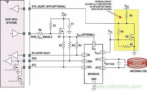 圖4中,I?C接口(SDL和SDA)和PIO信號(hào)(RF-AIP和RF-BUSY功能的多路復(fù)用線)是連接主機(jī)微控制器所必須的,RFID_VCC_ANABLE和SYS_ALERT_INT#信號(hào)可選。MOSFET Q1用于隔離。由于可通過RF和I?C接口訪問標(biāo)簽內(nèi)部的EEPROM,當(dāng)主機(jī)微控制器必須在存在HF場(chǎng)的情況下進(jìn)行連接時(shí),Q1為標(biāo)簽供電。然而,可選的Q2利用電路板上的穩(wěn)壓VCC切換開漏SYS_ALERT_INT# (這種情況下不安裝R4)。
