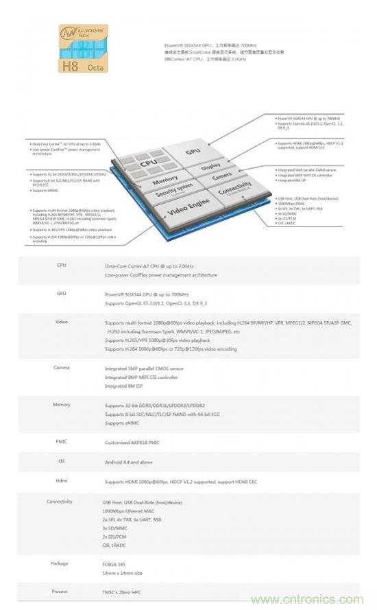 多媒體方面, H8支持多格式1080p@60fps視頻編解碼, 支持H.265/HEVC視頻處理,集成8M ISP圖像信號(hào)處理架構(gòu),可支持800萬(wàn)像素?cái)z像頭。 顯示方面,H8支持HDMI 1080p@60fps顯示,支持HDCP V1.2協(xié)議,支持HDMI CEC。此外,H8集成了全志新一代麗色顯示技術(shù),圖像顯示質(zhì)量進(jìn)一步提升。事實(shí)上,H8芯片最早是應(yīng)用于電視盒子。
