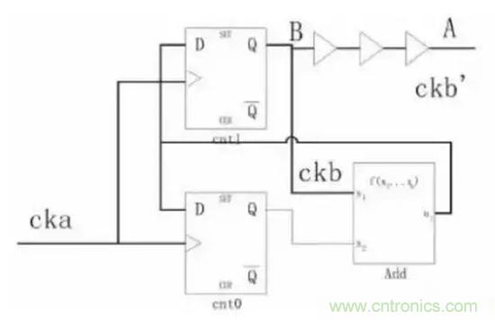為了方便討論,時鐘樹插入以后,假設(shè)A與B之間有1個ckaCycle的skew;從圖3可以看到如果采用A點作加法器的輸入時產(chǎn)生的波形是ckb’,采用B點作為輸入時的波形是ckb,顯然,從例1的代碼來看,ckb才是正確的。因此必須注意到,如果時鐘當(dāng)作普通的信號使用時可能帶來的問題,這類問題并沒有一個通用的解決辦法。在這個例子中,不采用時鐘樹上的信號才是正確的,但是在另外一些應(yīng)用中,就必須采用時鐘樹上的信號。比如,時鐘是CK的兩個觸發(fā)器中鎖存的數(shù)據(jù)再由CK的高電平和低電平選擇輸出,那么,這個時候就需要作為選擇信號的CK從時鐘樹上拉過來。因此,如果設(shè)計中用到了時鐘信號作為普通信號的情況,在后端設(shè)計時就必須特殊處理。
