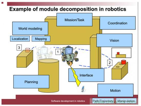 從人類第一臺可編程的機器人開發(fā)伊始,架構(gòu)問題就與之相伴而生。早在1996年,Garlan和Shaw在《軟件架構(gòu):一門新興學科的展望》就總結(jié)了移動機器人的基本設計需求, 如:(1) 慎思規(guī)劃和反應式行為;(2)容許不確定性;(3)考慮危險;(4)靈活性強。針對這些要求,他們評估了四種用于移動機器人的架構(gòu),包括控制回路(control loop)、分層(layers)、隱式調(diào)用(implicit invocation)、黑板(blackboard)。經(jīng)過了幾十年的實踐,一些架構(gòu)被逐漸淘汰,一些架構(gòu)逐漸被完善起來。
