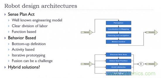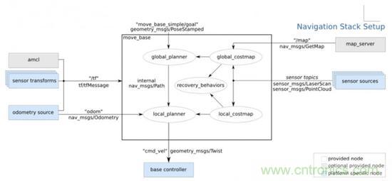沒有萬靈的結(jié)構(gòu),混合系統(tǒng)結(jié)合了SPA和反應體系的原理,將多種混合系統(tǒng)應用于在傳感器和電機輸出間進行協(xié)調(diào)來完成任務?;旌辖Y(jié)構(gòu)相結(jié)合最具吸引力的好處可能是:系統(tǒng)按照有利于完成任務的標準進行設計,而非刻板的遵循某一教條。但再復雜的機構(gòu),基本上也都是二者的組合。以ROS的導航包為例: