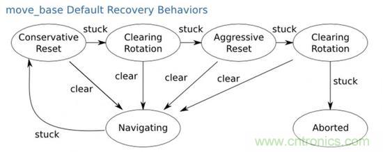 如果世界是完美的,那按照規(guī)劃的地圖行進到目的地就完事了。然而基于行為方法就是為了處理各種意外而生的。當機器人遇到障礙物或是被卡住的時候,內(nèi)嵌的基于行為的系統(tǒng)就開始發(fā)揮作用。會根據(jù)情況,在“行為庫”recovery_behaviors中調(diào)用某一預先設定的“行為”來擺脫困境。