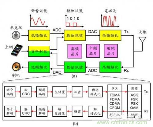 數(shù)字通信系統(tǒng)的架構(gòu)如圖二(a)所示,使用者可能使用智能型手機(jī)打電話進(jìn)行語(yǔ)音通信或上網(wǎng)進(jìn)行數(shù)據(jù)通信,我們分別說(shuō)明如下: