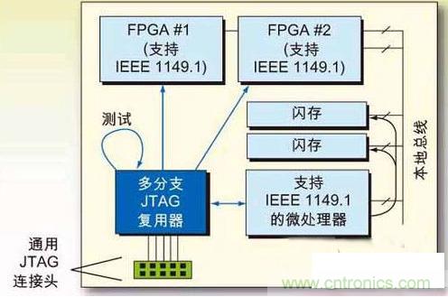 在每塊電路板上添加一個(gè)策略性IC器件-JTAG復(fù)用器件,目的是去除電路板上的多個(gè)1149.1接頭并管理多個(gè)JTAG通路。這個(gè)JTAG復(fù)用器件所占用的電路板空間通常比一個(gè)JTAG接頭還小,但卻簡化了元件的隔離,也簡化了提高接入效率所需掃描路徑的組織。
