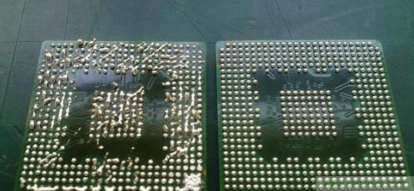 PBGA器件上若有過(guò)大應(yīng)力,例如將器件加熱到額定峰值溫度以上或過(guò)度暴露于高溫下,可能導(dǎo)致封裝分層或外部物理?yè)p壞(參見(jiàn)圖2和圖3)。對(duì)于要做進(jìn)一步分析的器件,移除不當(dāng)所引起的分層會(huì)加大找出真正故障機(jī)制的難度。因此,為了進(jìn)行有效的故障分析,妥善移除不良器件是十分必要的。