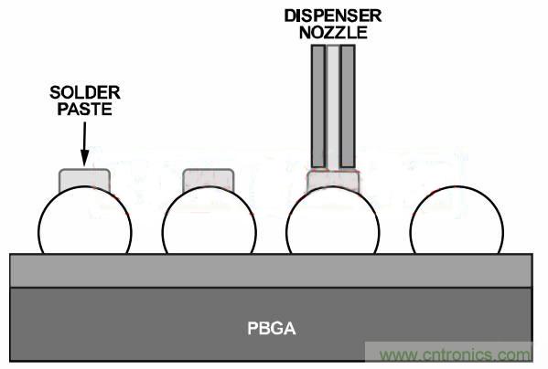 某些情況下,利用模板將焊膏均勻精確地涂敷在PCB焊盤(pán)上可能不可行,尤其是對(duì)于器件密度高或幾何空間緊張的電路板。這種情況下,應(yīng)考慮將焊膏涂敷在器件底部的焊球上。為此,可利用模板將焊膏涂敷在焊球上端,或?qū)⒑父喾峙浣o所有焊球(參見(jiàn)圖8和圖9)。可利用專(zhuān)門(mén)設(shè)計(jì)的夾具和/或返修設(shè)備來(lái)達(dá)到這一目的。
