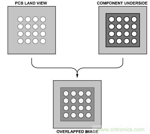 將器件精準(zhǔn)貼放到電路板上是很重要的。帶分光束光學(xué)系統(tǒng)的貼片設(shè)備有助于PBGA和電路板的對(duì)齊。此類(lèi)成像系統(tǒng)涉及到將PBGA焊球鏡像疊放在PCB焊盤(pán)鏡像上(參見(jiàn)圖10)。貼片機(jī)必須具有支持用戶沿x軸和y軸進(jìn)行微調(diào)(包括旋轉(zhuǎn))的能力。
