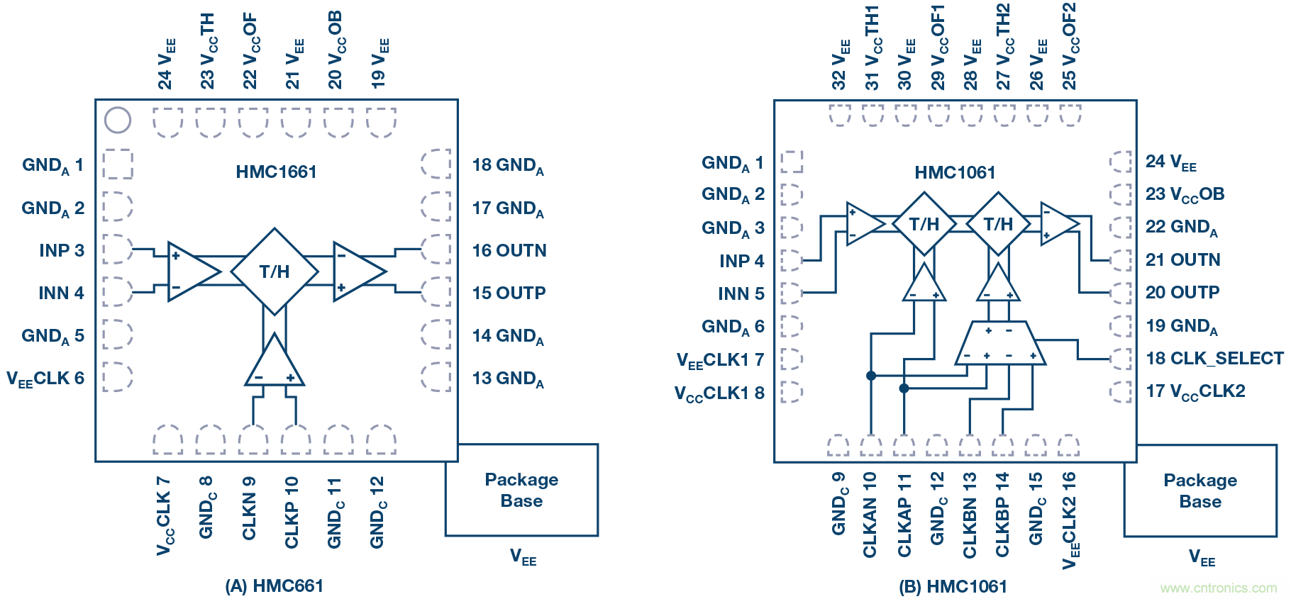 以單級THA HMC661為例,產(chǎn)生的輸出由兩段組成。在輸出波形(正差分時鐘電壓)的采樣模式間隔中,器件成為一個單位增益放大器,在輸入帶寬和輸出放大器帶寬的約束下,它將輸入信號復(fù)制到輸出級。在正時鐘到負(fù)時鐘躍遷時,器件以非常窄的采樣時間孔徑對輸入信號采樣,并且在負(fù)時鐘間隔內(nèi),將輸出保持在一個相對恒定的代表采樣時刻信號的值。配合ADC進(jìn)行前端采樣時,常常優(yōu)先使用單級器件(ADI 同時法布里了兩級THA 的型號HMC1061),原因是多數(shù)高速ADC已經(jīng)在內(nèi)部集成一個THA,其帶寬通常要小得多。因此,在ADC之前增加一個THA便構(gòu)成一個復(fù)合雙級組件(或一個三級組件,如果使用的是雙級HMC1061),THA在轉(zhuǎn)換器前面。采用同等技術(shù)和設(shè)計時,單級器件的線性度和噪聲性能通常優(yōu)于雙級器件,原因是單級器件的級數(shù)更少。所以,單級器件常常是配合高速ADC進(jìn)行前端采樣的最佳選擇。