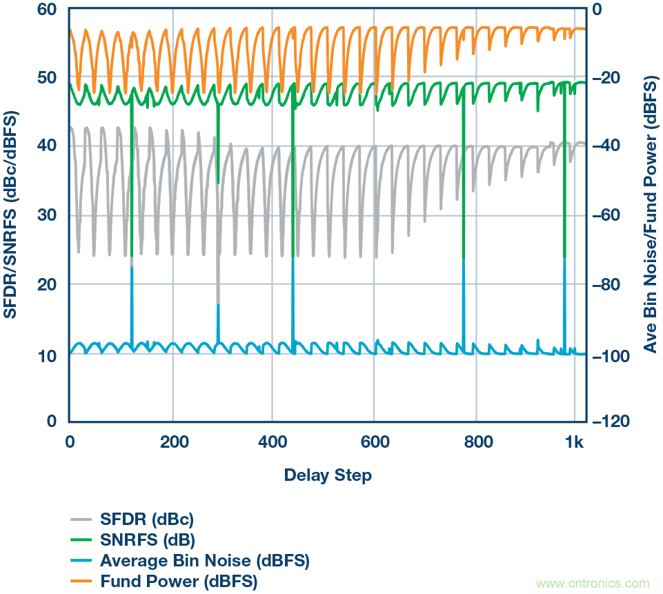 為了獲得最佳延遲設(shè)置,將一個信號施加于THA和ADC組合,該信號應(yīng)在ADC帶寬范圍之外。本例中,我們選擇一個約10 GHz的信號,并施加-6 dBFS的電平(在FFT顯示屏上捕獲)。延遲設(shè)置現(xiàn)在以二 進(jìn)制步進(jìn)方式掃描,信號的電平和頻率保持恒定。在掃描過程中顯示并捕獲FFT,收集每個延遲設(shè)置對應(yīng)的基波功率和無雜散動態(tài)范圍 (SFDR) 數(shù)值。