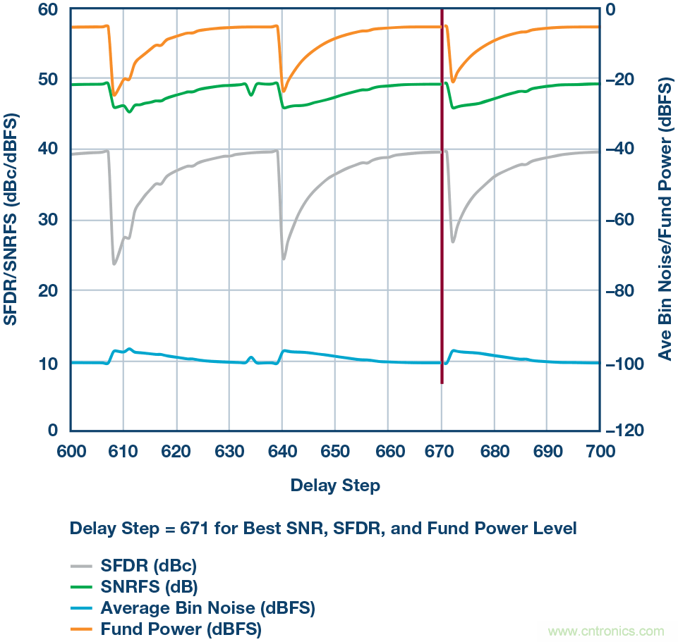 結(jié)果如圖3a所示,基波功率、SFDR和SNR將隨所應(yīng)用的每個設(shè)置而變化。如圖所示,當(dāng)把采樣位置放在更好的地方(THA將樣本送至ADC的過程之中)時,基波功率將處于最高水平,而SFDR應(yīng)處于最佳性能(即最低)。圖3b為延遲映射掃描的放大視圖,延遲設(shè)定點(diǎn)為671,即延遲應(yīng)該保持固定于此窗口/位置。請記住,延遲映射程序僅對系統(tǒng)的相關(guān)采樣頻率有效,如果設(shè)計需要不同的采樣時鐘,則需要重新掃描。本例中,采樣頻率為4 GHz,這是該信號鏈中使用的THA器件的最高采樣頻率。
