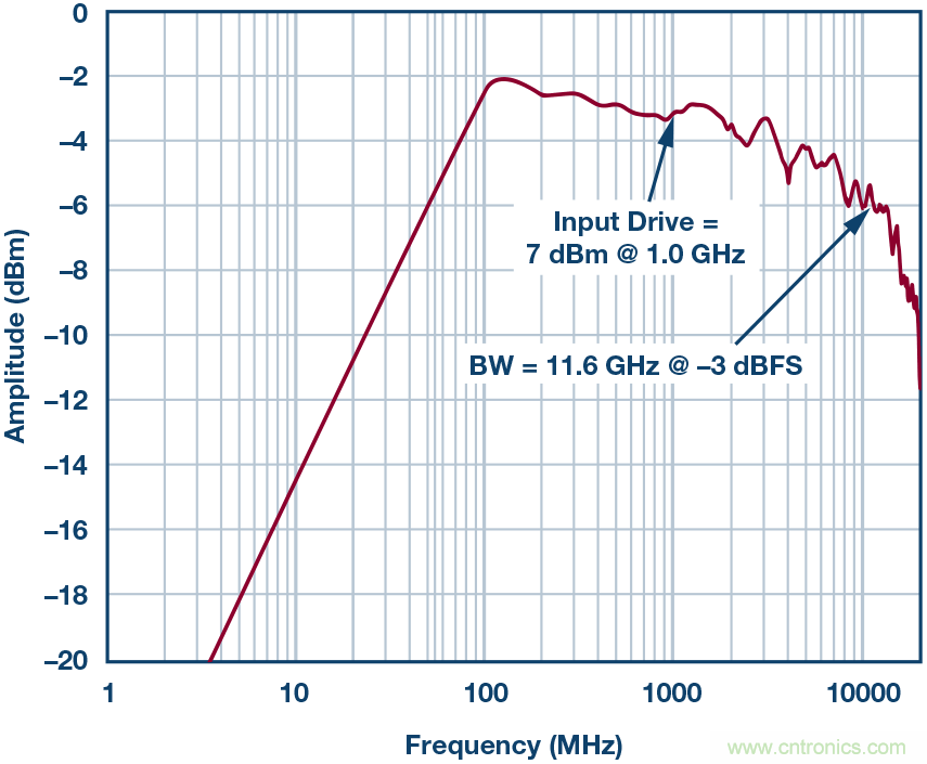 圖7顯示了通帶平坦度,證明在RF ADC之前增加一個THA可以實(shí)現(xiàn) 10 GHz的帶寬,從而充分?jǐn)U展AD9689的模擬帶寬。