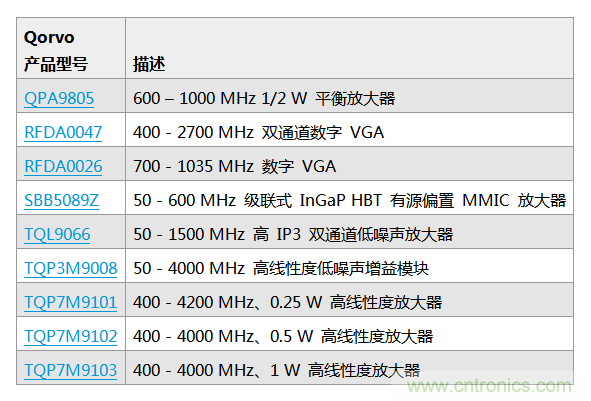 Qorvo 的小信號產(chǎn)品系列線性度高,功耗低,噪音小,尺寸小,極其便于集成。這一系列包括發(fā)送線性放大器、增益模塊和可變增益放大器,以及衰減器、開關(guān)、濾波器、雙工器和低噪聲放大器。少數(shù)此類解決方案包含: