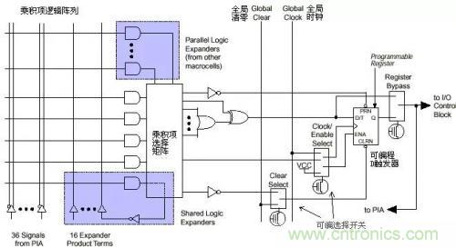 左側(cè)是乘積項(xiàng)陣列,實(shí)際就是一個(gè)與或陣列,每一個(gè)交叉點(diǎn)都是一個(gè)可編程 熔絲,如果導(dǎo)通就是實(shí)現(xiàn)“與”邏輯。后面的乘積項(xiàng)選擇矩陣是一個(gè)“或”陣列。兩者一起完成組合邏輯。圖右側(cè)是一個(gè)可編程D觸發(fā)器,它的時(shí)鐘,清零輸入都可 以編程選擇,可以使用專用的全局清零和全局時(shí)鐘,也可以使用內(nèi)部邏輯(乘積項(xiàng)陣列)產(chǎn)生的時(shí)鐘和清零。如果不需要觸發(fā)器,也可以將此觸發(fā)器旁路,信號直接 輸給PIA或輸出到I/O腳。