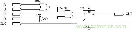 下面我們以一個(gè)簡單的電路為例,具體說明PLD是如何利用以上結(jié)構(gòu)實(shí)現(xiàn)邏輯的,電路如下圖: