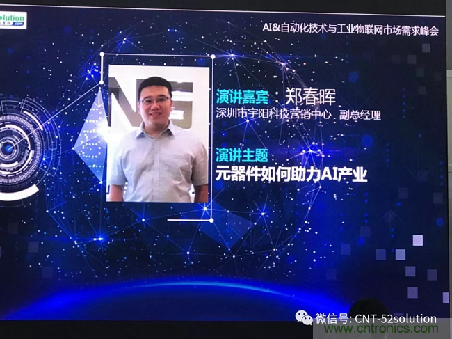 為積極推動跨行業(yè)的電子開發(fā)需求與方案服務(wù)商的對接,大力發(fā)展技術(shù)外包服務(wù),服務(wù)國家創(chuàng)新戰(zhàn)略,搶占人工智能技術(shù)和應(yīng)用的制高點(diǎn),近日,我愛方案網(wǎng)策劃主辦了2018AI&自動化技術(shù)與工業(yè)物聯(lián)網(wǎng)市場需求峰會,這是第六屆中國電子信息博覽會的核心活動。中國優(yōu)秀的元件技術(shù)供應(yīng)商宇陽科技副總鄭春暉在峰會上做《元器件如何助力AI產(chǎn)業(yè)》的大會報告。