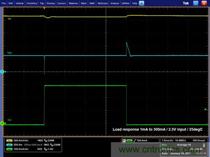 a) 由于有限的控制回路速度,負(fù)載電流的快速變化會導(dǎo)致輸出電壓的變化。有時(shí)內(nèi)部調(diào)節(jié)回路無法對電流的快速變化(由于時(shí)間延遲)作出反應(yīng),就會導(dǎo)致通常約為幾十毫伏(mV)的下沖/過沖。