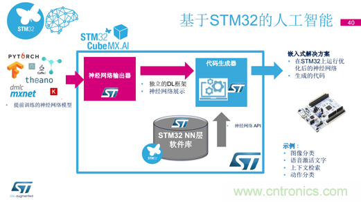 “順應(yīng)嵌入式行業(yè)潮流,ST將會(huì)在STM32新產(chǎn)品中嘗試融合RTOS和Linux兩大系統(tǒng)。同時(shí),在數(shù)據(jù)安全方面,ST支持TrustZone的全新系列產(chǎn)品也即將上市,通過(guò)采用STM32架構(gòu)和Arm® Cortex-M33® 內(nèi)核實(shí)現(xiàn)了更高的安全性。而且ST還開(kāi)發(fā)出STM32物聯(lián)網(wǎng)安全工具箱,能夠在STM32上實(shí)現(xiàn)可擴(kuò)展的嵌入式安全功能;以及通過(guò)認(rèn)證的STM32軟件開(kāi)發(fā)工具——符合IOS智能家居標(biāo)準(zhǔn)的Apple Homekit BLE,這套工具將于2018年中期率先支持STM32L476 (512 kB+閃存)和 STM32F413平臺(tái),之后支持STM32WB系列。”Daniel Colonna強(qiáng)調(diào),“ST還將致力于為廣大工程師帶來(lái)更簡(jiǎn)單的AI開(kāi)發(fā)工具,允許在STM32上運(yùn)行優(yōu)化后的神經(jīng)網(wǎng)絡(luò)生成的代碼,加速開(kāi)發(fā)圖像分類(lèi)、語(yǔ)音激活文字等應(yīng)用。”