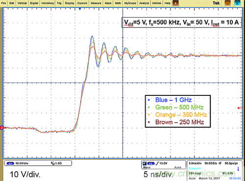 用EPC9080演示板演示了另一個(gè)測(cè)試案例,因板上eGaN FET的較低導(dǎo)通電阻和較高電容使得它具有低得多的振鈴頻率和開關(guān)速度[4]。相應(yīng)的波形如圖2所示(下圖)。由于fr2低于系統(tǒng)的-3dB頻率,因此438MHz振鈴頻率(fr2)及其使用1GHz(藍(lán)色)探頭測(cè)得的振幅是正確的。1GHz(藍(lán)色)和500MHz(綠色)波形可準(zhǔn)確捕獲所有細(xì)節(jié)。但對(duì)于350MHz(橙色)和250MHz(棕色)的系統(tǒng)帶寬,fr2高于系統(tǒng)帶寬。因此,它捕捉到振鈴波形的形狀,但明顯減弱了振鈴,因此低估了過沖。不同系統(tǒng)帶寬測(cè)得的上升時(shí)間約為3ns。根據(jù)(2),我們使用的最低的帶寬是250MHz,對(duì)應(yīng)于1.6ns的上升時(shí)間,并且所有情況下的上升時(shí)間都可以準(zhǔn)確測(cè)量到。表2作出總結(jié)。