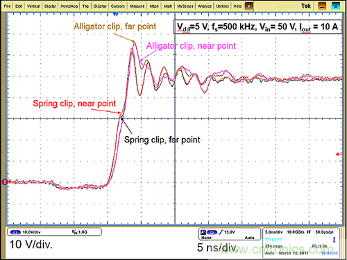 圖4的測(cè)得波形清楚地表明,探頭技術(shù)比測(cè)量點(diǎn)的選擇重要。雖然有邊緣衰減,紅色和黑色波形幾乎相同。無論測(cè)量點(diǎn)的選擇如何,使用鱷魚夾時(shí)的波形形狀都非常不準(zhǔn)確。我們建議,彈簧夾技術(shù)應(yīng)與最靠近功率器件的測(cè)量點(diǎn)(“近點(diǎn)”)結(jié)合使用。