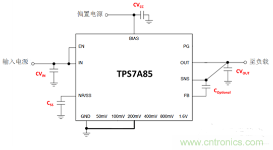 為什么少了四個組件呢?TPS7A85具有TI的可調(diào)輸出功能,用戶可以利用電壓設(shè)置引腳動態(tài)地設(shè)置VOUT。只要這些引腳中的其中一個接地,相應(yīng)的電壓便會加上800mV內(nèi)部參考電壓。因此,通過將200mV引腳接地,VOUT便立即變?yōu)?.0V。