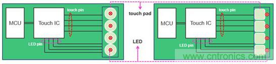 從LED驅(qū)動(dòng)的角度,比較二者的異同。通常,觸控 IC內(nèi)置了LED Driver。如果應(yīng)用方案中需要使用LED表示觸控動(dòng)作的有/無,并且應(yīng)用產(chǎn)品的結(jié)構(gòu)設(shè)計(jì),要求LED緊鄰觸控電極,如圖5所示,那么使用觸控 IC更方便PCB的Layout。