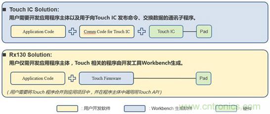 從初次建立觸控應(yīng)用程序的工作負(fù)荷及調(diào)試難度對(duì)比二者的不同。使用觸控 IC和觸控 MCU應(yīng)用方案中軟、硬件組成示意圖,如圖1所示。