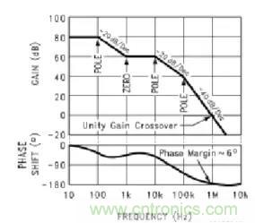 假設(shè)直流增益為80dB(10-100Hz處的增益),100到1KHz增益減少了20dB,10K-100KHz增益減少20dB,100K-1MHz增益減少40dB(斜率有-20dB/10倍頻的變化)。圖中可以看出有3個POLE,一個ZERO。1MHz處的增益是0dB,說明1MHz的小信號在此截止,此回路的帶寬就是1MHz。