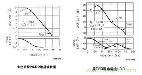 假設(shè)一個LDO系統(tǒng)在0dB時的截止頻率是30kHz。在其輸出端增加輸出電容為10uF,輸出電容的ESR=1ohm。則在16kHz處產(chǎn)生零點(diǎn)。