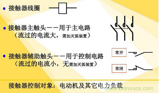 接觸器用來接通或斷開功率較大的負載,用在(功率)主電路中,主觸頭可能帶有連鎖接點以表示主觸頭的開閉狀態(tài)。