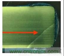 因為MLCC主要成分是陶瓷,在放置元件,分板,上螺絲等工序中,很可能因為機械應力過大導致電容受擠壓破裂,從而導致潛在的漏電失效。此時的裂縫一般呈斜線,從端子與陶瓷體的結(jié)合處開裂。