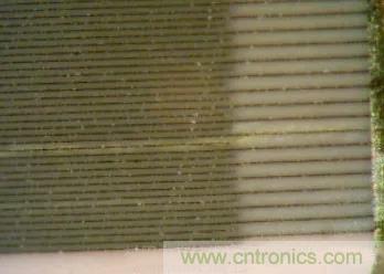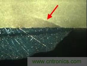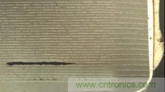 熱沖擊主要發(fā)生在波峰焊時,溫度急劇變化,導致電容內(nèi)部電極間出現(xiàn)裂縫,一般需要通過測量發(fā)現(xiàn),研磨后觀察,通常是較小的裂縫,需要借助放大鏡確認,少數(shù)情況下會出現(xiàn)肉眼可見的裂縫。