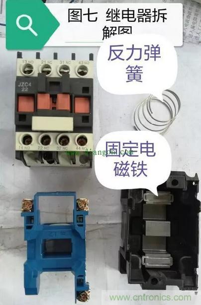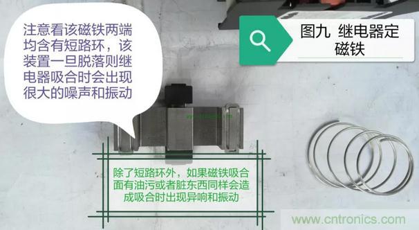 接下來我們再來看一下繼電器內(nèi)部吸合部分的構(gòu)造,在這部分當(dāng)中以固定吸合磁鐵上短路環(huán)所引發(fā)的故障最為常見,詳情請看圖七至圖九的展示: