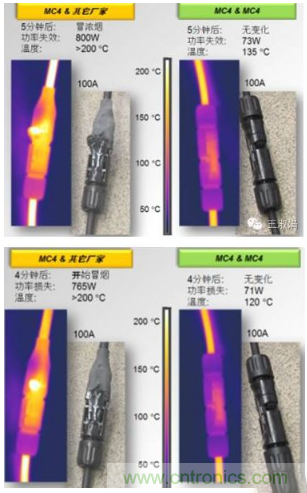 而與之形成鮮明對(duì)比的是MC4自身公母頭插合后的測(cè)試結(jié)果:除了溫度有初始的90℃升高到135℃及功率損失由69W升高到73W外,外觀并無明顯的變化。