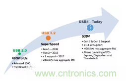 畢竟USB4是下一代USB數(shù)據(jù)規(guī)范,增加了接口帶寬并支持其他協(xié)議共享物理接口。共享USB接口的最大協(xié)議是英特爾的Thunderbolt。自2000年以來,USB-IF一直在系統(tǒng)地提高接口的吞吐量,以滿足客戶不斷增長的數(shù)據(jù)需求。從2000年的USB 2.0開始,到2013年的USB3.2,USB數(shù)據(jù)速率已從480Mbps擴展到20Gbps。USB4將進一步提高數(shù)據(jù)速率到40Gbps吞吐量。