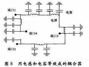 由于第二部分設(shè)計(jì)的天線傳輸線阻抗是50 Ω,所以1/4傳輸線的阻抗是70.7 Ω,將710 MHz代入,則可以求得L=15.8 nH,C=3.17 pF。這樣,就可以設(shè)計(jì)出180°的混合耦合器如圖8所示。將耦合器的3,4端口通過(guò)通孔連接天線,1,2端口接饋電網(wǎng)絡(luò),就可構(gòu)成一個(gè)雙天線的去耦合系統(tǒng)。
