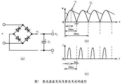 50Hz交流電壓經(jīng)過全波整流后變成脈動直流電壓u1,再通過輸入濾波電容得到直流高壓U1。在理想情況下,整流橋的導(dǎo)通角本應(yīng)為180°(導(dǎo)通范圍是從 0°~180°),但由于濾波電容器C的作用,僅在接近交流峰值電壓處的很短時間內(nèi),才有輸入電流流經(jīng)過整流橋?qū)充電。50Hz交流電的半周期為 10ms,整流橋的導(dǎo)通時間tC≈3ms,其導(dǎo)通角僅為54°(導(dǎo)通范圍是36°~90°)。因此,整流橋?qū)嶋H通過的是窄脈沖電流。橋式整流濾波電路的原 理如圖1(a)所示,整流濾波電壓及整流電流的波形分別如圖l(b)和(c)所示。