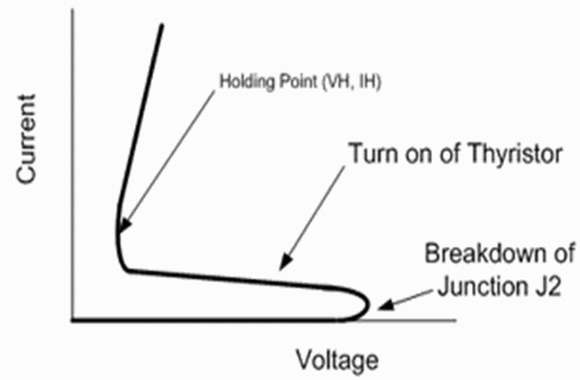 晶閘管的過壓保護(hù)設(shè)備是基于一對雙極性晶體管,這一對雙極性晶體管是由四層不同摻雜的N,P極組成,如圖1所示。N型摻雜的N1,P型摻雜的P1,和N型摻雜的N2分別構(gòu)成NPN晶體管的發(fā)射極,基極和收集極,而P型摻雜的P2,N型摻雜的N2,和P型摻雜的P1分別構(gòu)成了PNP晶體管的發(fā)射極,基極,和收集極。這樣一來一個(gè)晶體管的收集極是另外一個(gè)晶體管的基極。按這種方法那么一個(gè)晶體管的發(fā)射極到收集極流過的電流就是流向另一個(gè)晶體管的基極的電流。如果加一個(gè)從陽極到陰極的正電壓,那兩個(gè)三極管的發(fā)射極與基極之間,即J1和J3,都是正向電壓偏置。只有J2處PN結(jié)形成反向電壓偏置時(shí)才能阻礙電流流動。如果從陽極到陰極的電壓增加到大于J2處PN結(jié)的擊穿電壓,電流就開始直接流向兩個(gè)雙極性晶體管的基極。這使得兩個(gè)三極管都導(dǎo)通,會導(dǎo)致含有兩個(gè)三極管的晶閘管的電阻下降,并且晶閘管兩端的電壓也會減小。如圖2所示我們可以看到晶閘管的從陽極到陰極的正電流存在時(shí)的電壓-電流曲線。有著這樣的電壓-電流曲線特性的保護(hù)器件一定會有非常優(yōu)秀的保護(hù)特性。當(dāng)保護(hù)器件在觸發(fā)后,工作電壓下降時(shí)保護(hù)器件可以承受大的電流并且自身功耗很小。事實(shí)上,具有這種電壓-電流曲線特性的保護(hù)器件通常被稱為“消弧”保護(hù)器件,因?yàn)檫@就好比是通過把一個(gè)“金屬消弧”放置在需要保護(hù)的端口來實(shí)現(xiàn)保護(hù)作用的。值得注意的是只有當(dāng)電流或者電壓降到閾值點(diǎn)以下,才能使得晶閘管回到高阻態(tài),如圖2所示。