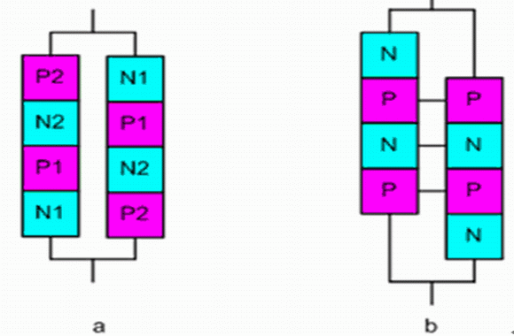 圖5 非平行的晶閘管 a) 一對非平行的晶閘管 b) 集成于單個(gè)硅器件的非平行的晶閘管