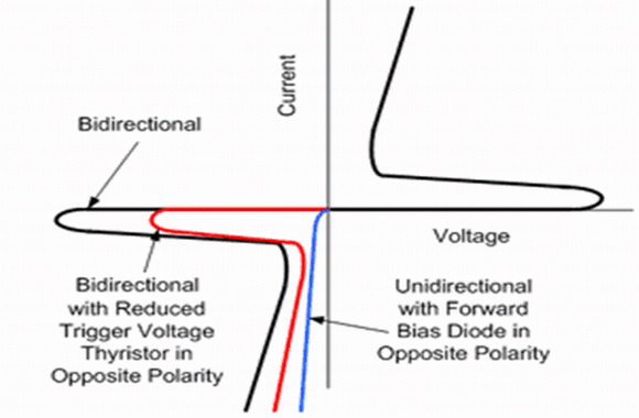大多數(shù)晶閘管浪涌保護(hù)器件(TSPD)是對稱的雙向特性的,但也有內(nèi)含二極管單向特性的,如圖7所示。而不對稱的雙向晶閘管浪涌保護(hù)器件(TSPD)是在一個(gè)極性方向有著減小了的觸發(fā)電壓,如圖7所示。